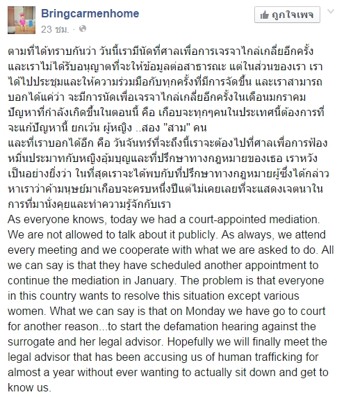 นอกจากนี้ ทาง เฟซบุ๊ก Bringcarmenhome ได้มีการโพสต์ข้อความซึ่งเนื้อหาบางส่วนระบุว่าจะมีการฟ้องร้องแม่อุ้มบุญและที่ปรึกษาทางกฎหมายของแม่อุ้มบุญ ในข้อหาหมิ่นประมาท จากการที่ถูกระบุว่าเป็นพวกค้ามนุษย์ แต่ไม่เคยเข้ามานั่งคุยกันสักครั้ง