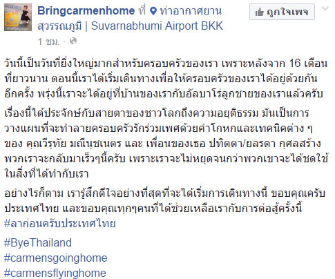 ครอบครัวน้องคาร์เมน โพสต์ด้วยความยินดี ขณะขึ้นเครื่องกลับประเทศ ลั่น จะกลับมาใหม่เพื่อเช็กบิลแม่อุ้มบุญ พร้อมขอบคุณคนไทยที่ให้การช่วยเหลือโดยตลอด