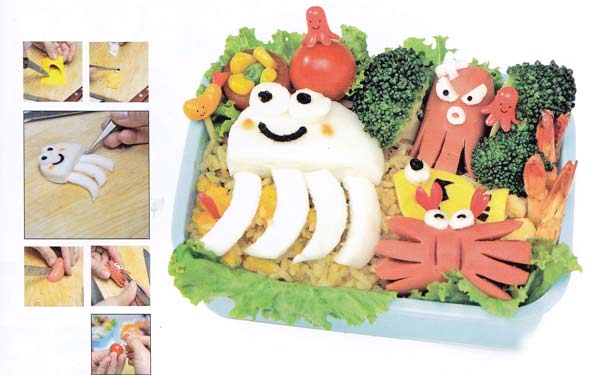 3.ตกแต่งหน้าตาด้วยสาหร่ายและแก้มแดงจากซอสมะเขือเทศ ไส้กรอกรูปปลาหมึกและปู (ดูวิธีทำ)
